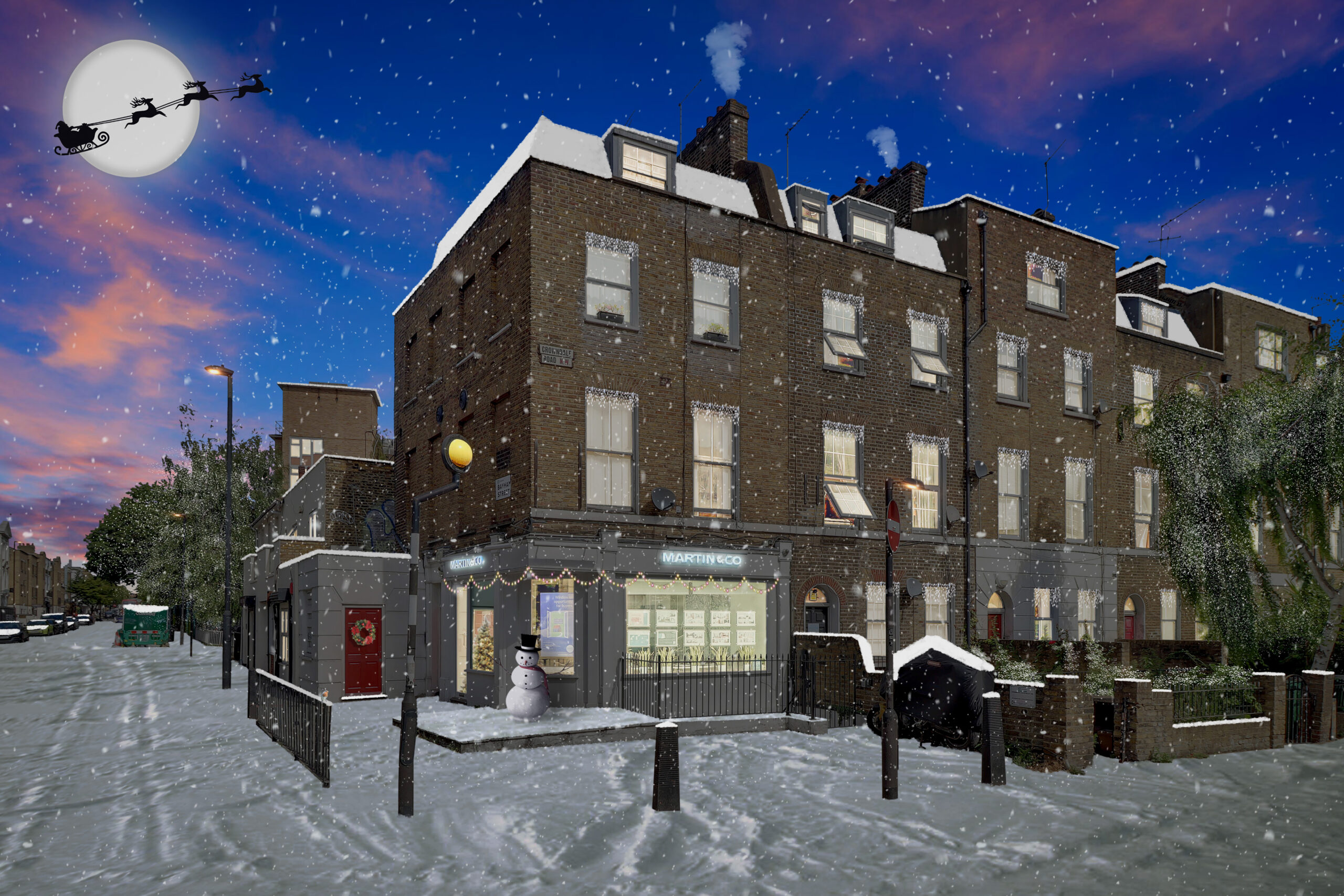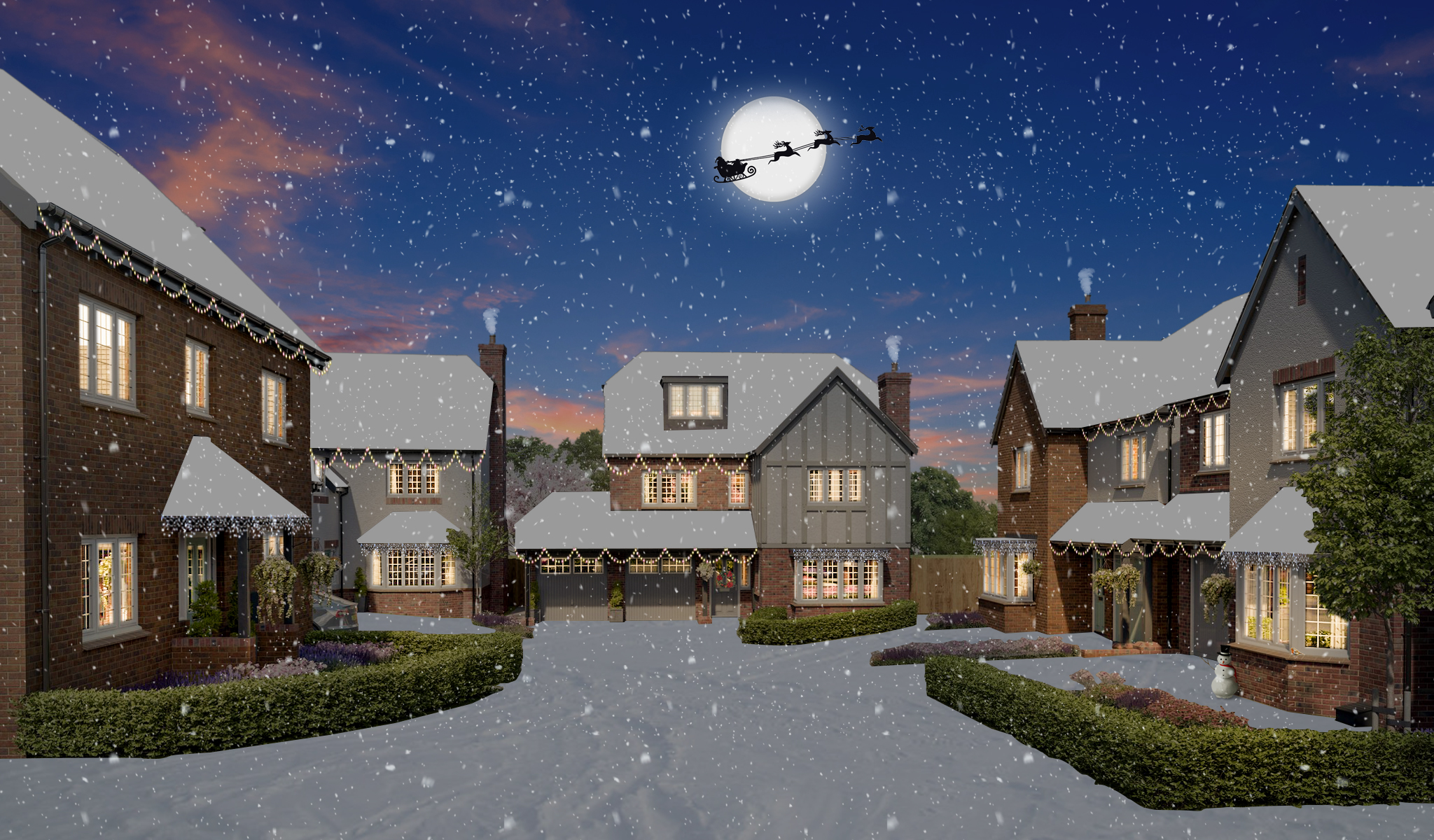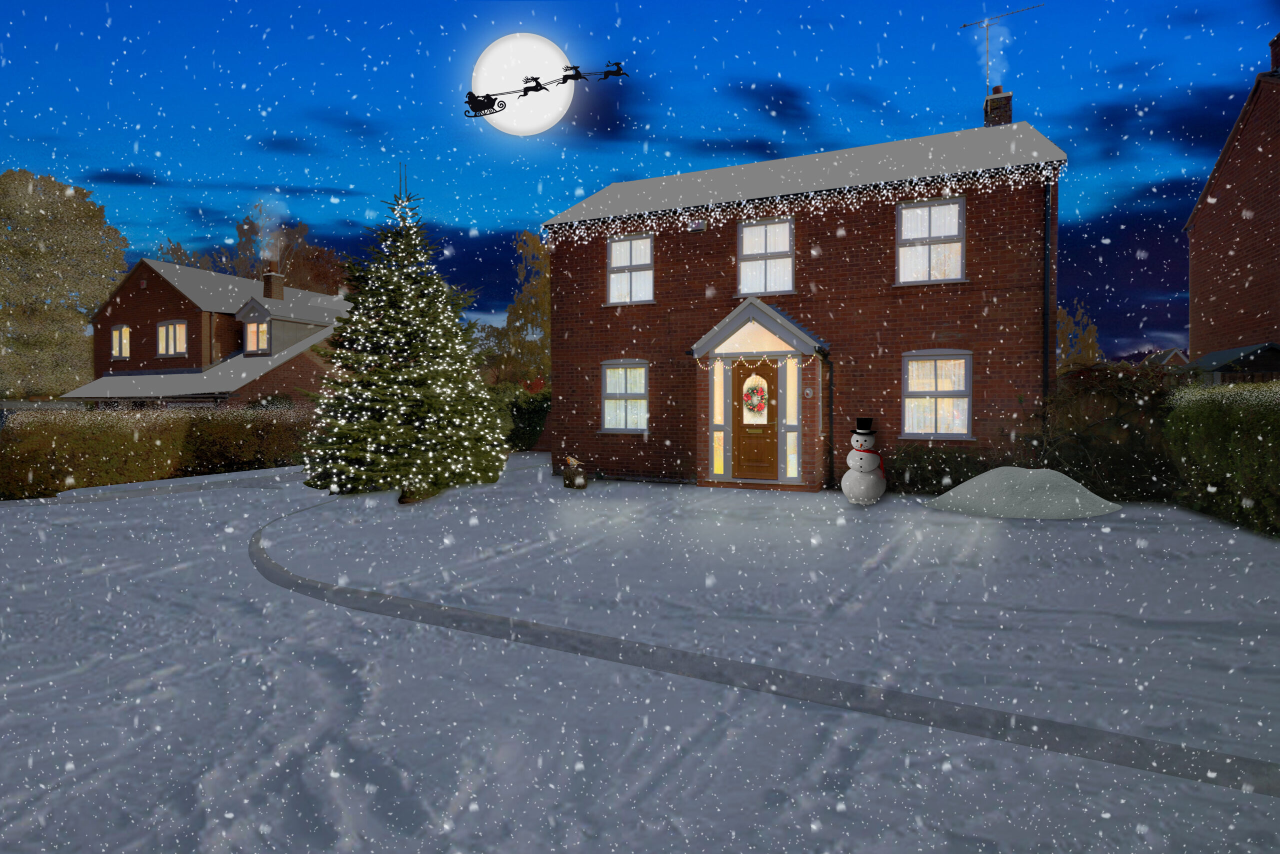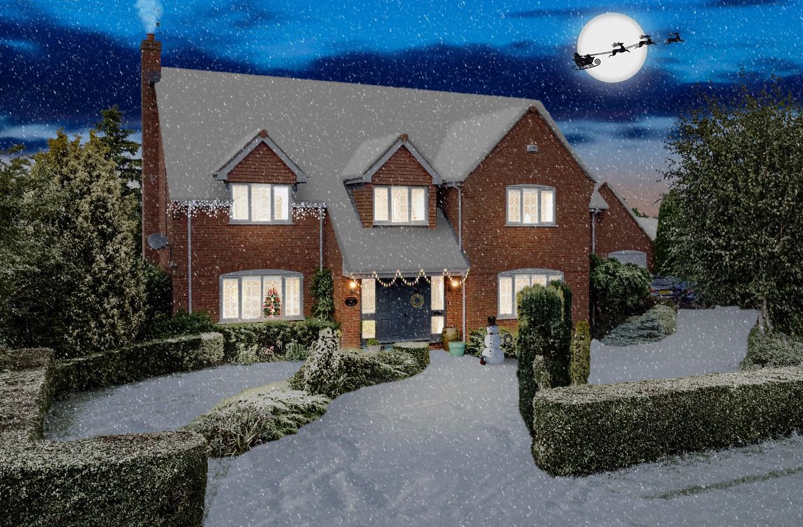 ‘Winter Wonderland’ images come complete with Santa in the sky, day time turned to night with lights in property turned on, Christmas lights and snow to the ground and snowflakes in the air. You can also add text if required.